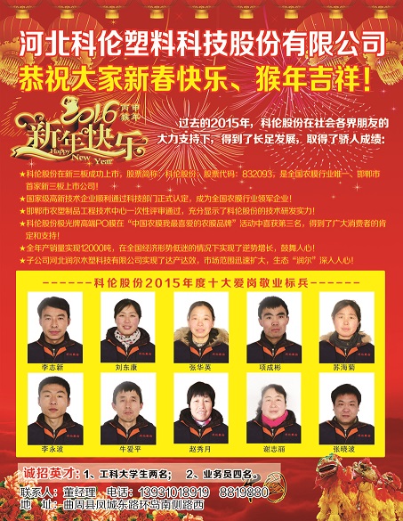 点击数:71012016-01-28 08:30:38 来源: 完美官网股份有限公司|农用薄膜|po膜|转光膜|EVA消雾膜|高效日光膜|棚膜|地膜|包装膜|土工膜|